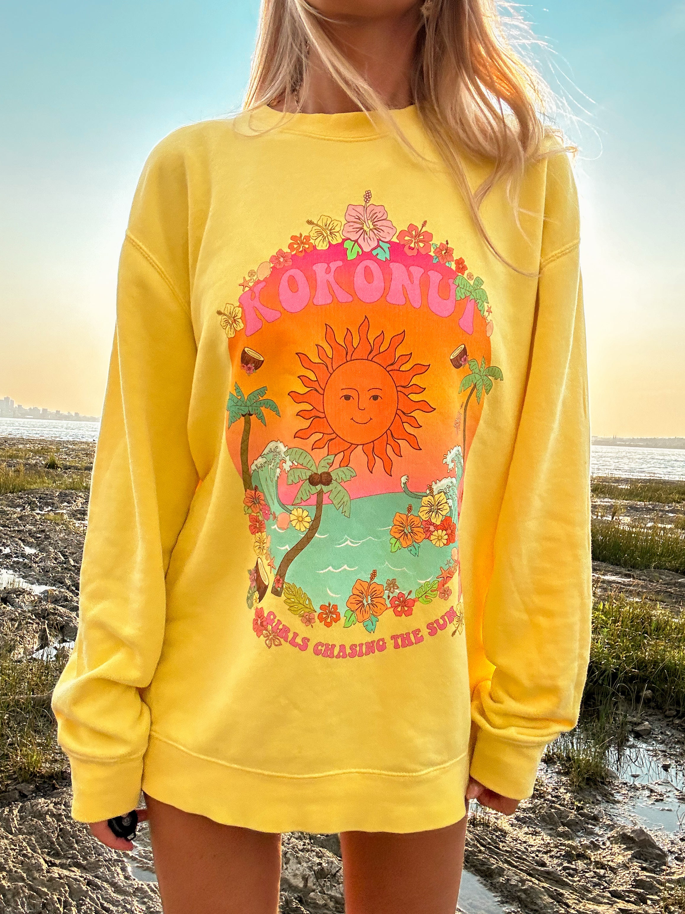 Parfait pour les matins frais, les après-midis frais et les nuits d'été, le sweat-shirt à col rond "girls chasing the sun" est fabriqué en coton mélangé lourd pour vous garder au chaud et à l'aise. Ce sweat-shirt surdimensionné présente un grand graphique coloré sur la poitrine pour lui donner un look de plage.