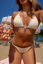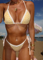 A modern take on the classic tie side bottom, featuring adjustable side ties let you find your perfect fit, while the slim shape is ideal for creating minimal tan lines. This high-cut bikini offer flattering V-shape front that accentuates your waist and elongates your legs. With medium back coverage. Finished with delicate straps & lace details with a subtle charm jewelry accent for an effortlessly feminine touch.