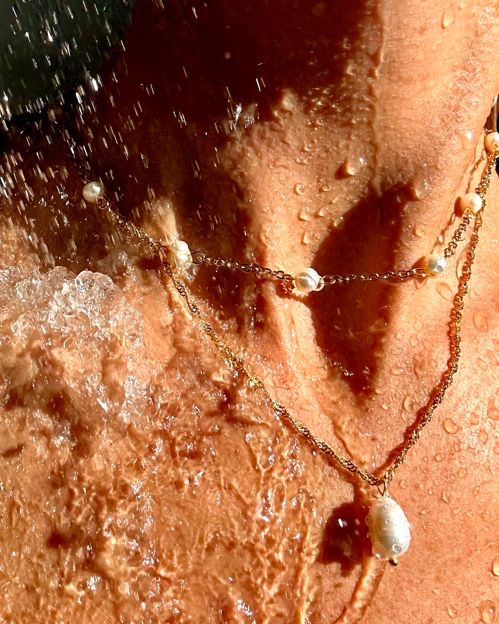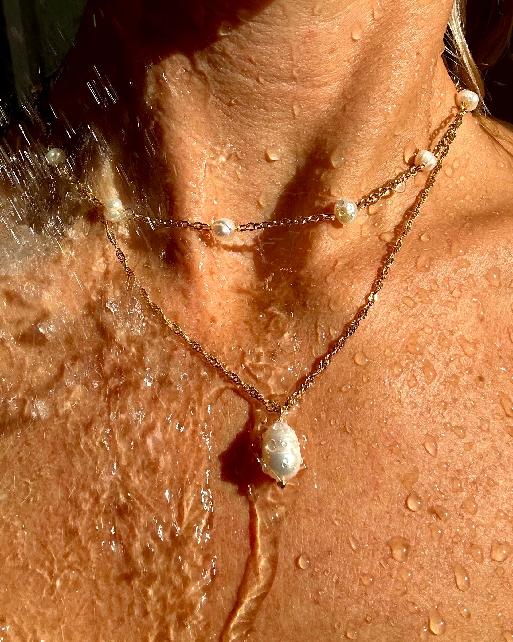The Ocean pearl necklace is made from 18k gold plated stainless steel with a freshwater pearl, so will not tarnish and is hypoallergenic. The 2 necklaces are sold separately