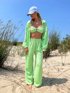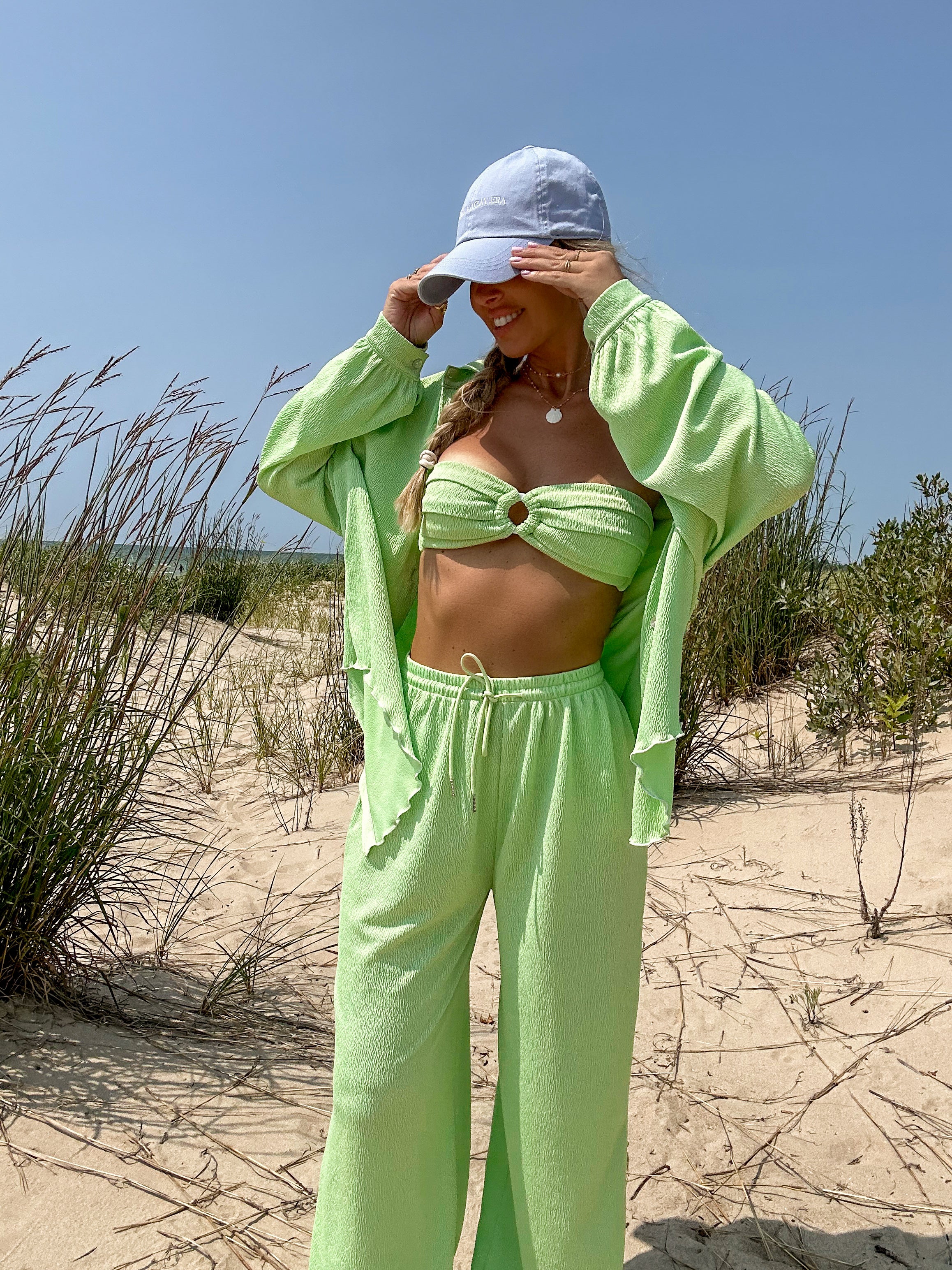 Simple and chic, our sunshine soul pants is the perfect beach pants you've been searching for. Designed in our light weight crinkle fabric, this pant features an adjustable elastic waist, that allows you to wear this pant low on your hips or high on your waist and fits many different size. The material and the oversized fit makes them the must comfiest pants. Trust it, you’ll wanna wear them all the time! Pair with the sunshine soul shirt or bikini top