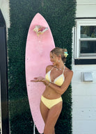 Flirty, feminine, and irresistibly charming this bikini top is a must-have for sun-soaked days. Featuring a delicate and unique ribbon detail, this piece is designed with intricate details that make it truly unique. A dainty bow accent at the front adds a sweet, playful feminity touch, while the scalloped lace trim elevates the design with a hint of vintage elegance. The adjustable triangle cups provide a flattering fit.